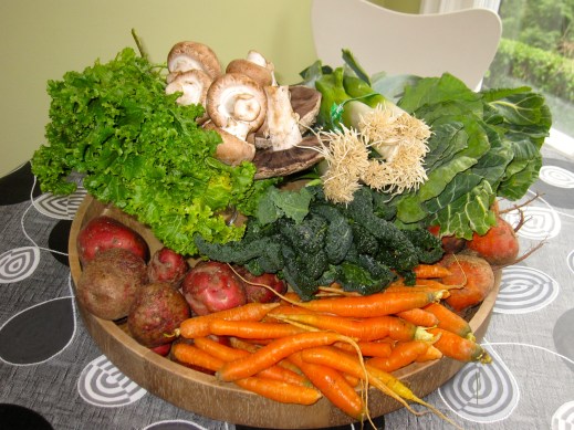 Well, we’ve got Italian (pizza night!), we’ve got French, we’ve got Mexican, we’ve got Asian, and we’ve got good old fashioned American beef barley soup & banana cake! A week’s worth of honest, simple cooking using veggies from my local farmer. Thank you Hood River Organic, for this table toppling with bounty from our beautiful Columbia Gorge!