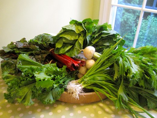 chard, gourmet greens, lettuce, mizuna, mustard greens, scallions, turnips