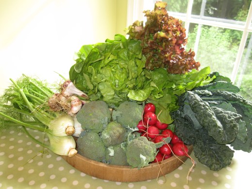 We like any excuse for a picnic!  A concert, a ball game, beach day, visitors in town, a bike ride…even just the sunny weather.  I love to survey my veggie loot to i.d. good candidates for salads that travel well and don’t easily wilt or get mushy.  These are just two favorites.  The first one starring fennel is an amazingly fresh and easy way to enjoy fennel in its crunchy, just-picked state.  I have to admit, the first time I got fennel in my CSA box, I laughed out loud.  I guess I had just never bought it – complete with it’s tall stems and wild fronds, it’s a bit intimidating!  And although the fronds can be a wonderful herb garnish, mostly what you’ll use is just the bulb.  The flavor is sweet and slightly licorice-like.  The best thing to use in slicing fennel oh-so thinly is a mandolin (which I don’t have.)  I’ll either employ my Magimix, or just slice as thinly as I can with a sharp knife.  Be sure to save all that wonderful orange juice that gathers as you slice your oranges; add this to the dressing as well.  Any of your favorite olives are good in this salad – we enjoy green as well.  The broccoli salad is super yummy and picnic-worthy too.  I’ll use at least a pound of it in this Italian-inspired tuna & bean combination.  I’ll skip the pepper and celery, and toss in some thinly sliced radishes instead for the color and crunch.  Add whatever fresh herbs you’ve got, and the tangy lemon vinaigrette.  Along with a fresh baguette and a selection of cheeses, this is summer picnic fare at its finest…fresh from the farm.