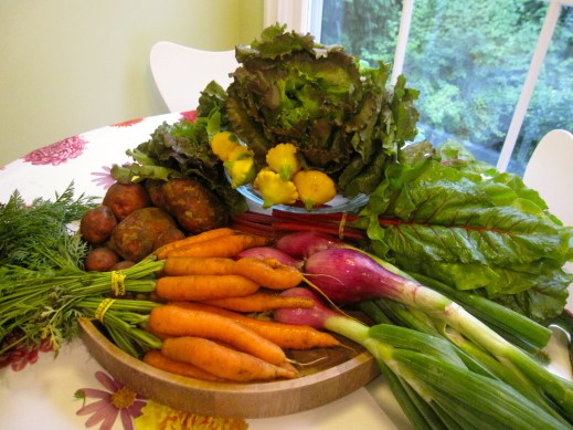 carrots, chard, dill, gourmet greens, lettuce, onions, potatoes, summer squash