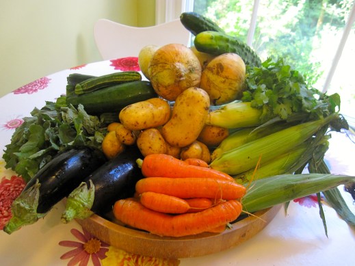 carrots, cilantro, corn, cucumbers, eggplant, kale, onions, potatoes, zucchini, tomatoes