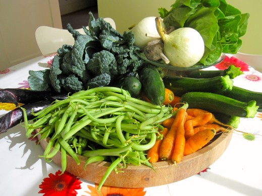 carrots, cucumbers, eggplant, garlic, gourmet greens, green beans, kale, lettuce, onions, zucchini