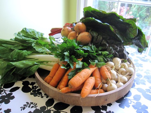 carrots, chard, gourmet greens, joi choi, onions, parsley, turnips, sweet peppers, winter squash