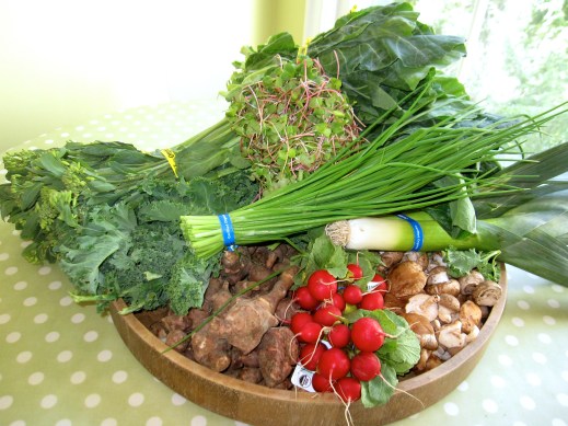 braising mix, chives, collard greens, kale raab, kale, leeks, micro greens, mushrooms, radishes, sunchokes