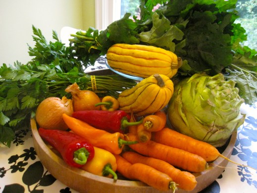 carrots, gourmet greens, kale, kohlrabi, onions, parsley, sweet peppers, winter squash