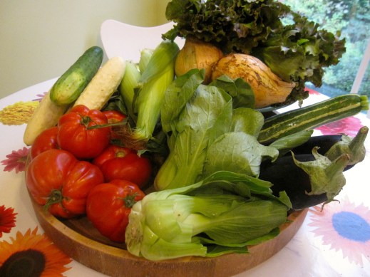 baby bok choy, corn, cucumbers, eggplant, gourmet greens, lettuce, onions, summer squash, tomatoes