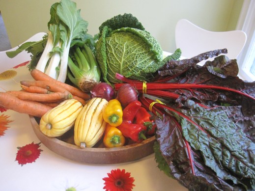 bok choy, savoy cabbage, carrots, celery, chard, gourmet greens, red onions, sweet peppers, delicata squash