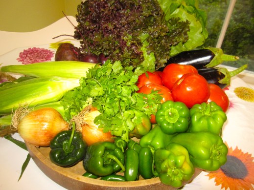 beets, bell peppers, cilantro, corn, cucumbers, eggplant, gourmet greens, jalapeños, lettuce, onions, poblano peppers, tomatoes