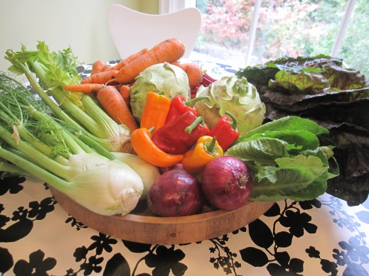 carrots, celery, chard, fennel, gourmet greens, kohlrabi, romaine, red onions, sweet peppers