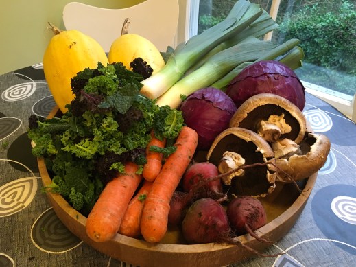 beets, cabbage, carrots, kale, leeks, mushrooms, winter squash