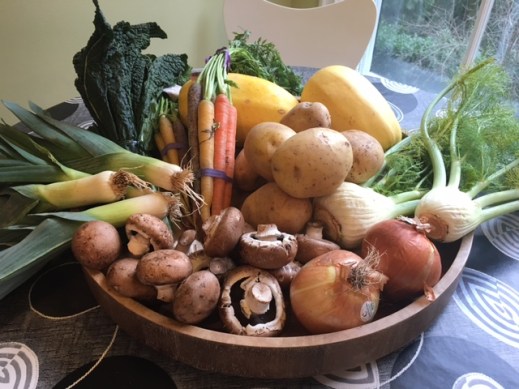 carrots, fennel, kale, leeks, mushrooms, onions, parsnips, potatoes, squash