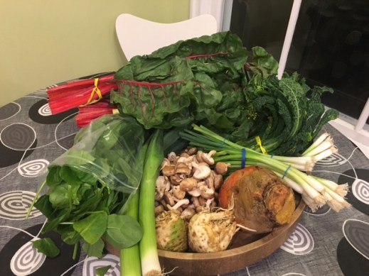 beets, celeriac, garlic, green onions, kale raab, leeks, mushrooms, red chard, spinach