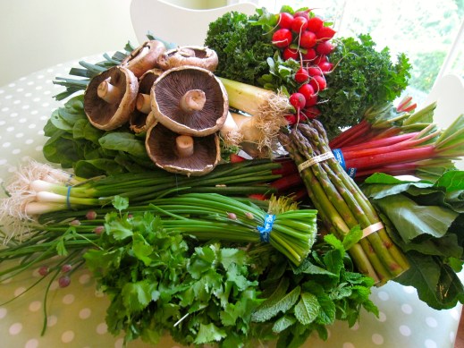 asparagus, cilantro, collard greens, green onions, kale, mint, leeks, mushrooms, radishes, rhubarb, spinach