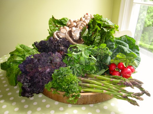asparagus, braising greens, chard, collard greens, mushrooms, pea shoots, radishes, kale, spinach