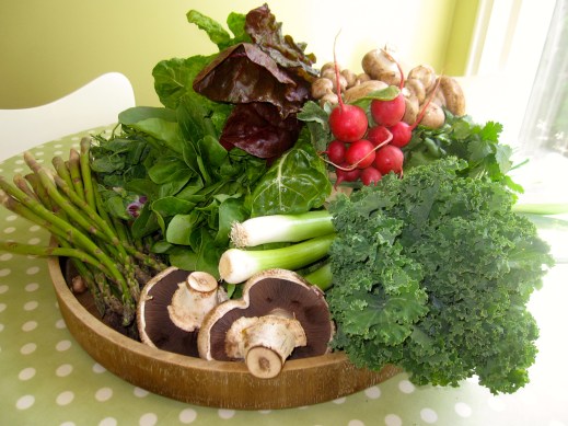 asparagus, chard, cilantro, kale, leeks, mushrooms, pea shoots, radishes, spinach