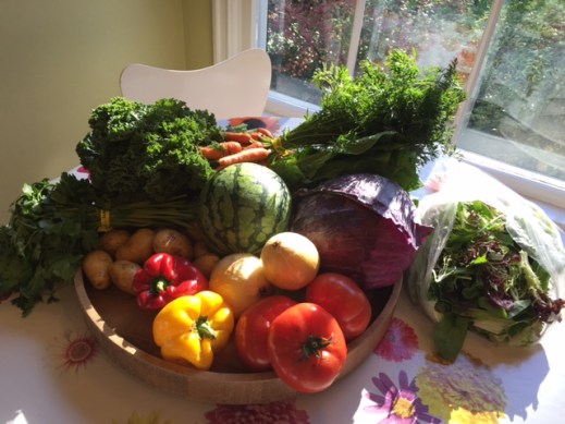 cabbage, carrots, gourmet greens, kale, lettuce, onions, parsley, peppers, potatoes, tomatoes, watermelon